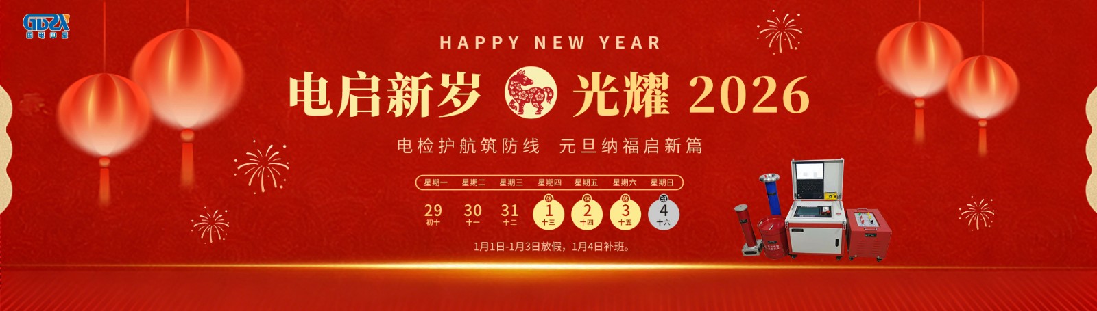 元旦鐘聲送吉祥,喜迎新年新氣象!根據(jù)國(guó)家節(jié)假日安排,結(jié)合公司實(shí)際情況,2026年元旦節(jié)放假安排如下:放假時(shí)間:2026年1月1日-1月3日放假,共3天。1月4日(星期日)正常上班。如有業(yè)務(wù)事宜請(qǐng)與相關(guān)業(yè)務(wù)人員聯(lián)系,相關(guān)聯(lián)系方式如下:1、產(chǎn)品和服務(wù)咨詢(xún)熱線(xiàn):400-0828-027 / 132941535862、電氣試驗(yàn)技術(shù)咨詢(xún)熱線(xiàn):186071457333、售后服務(wù)專(zhuān)線(xiàn):027-65526006萬(wàn)象更新迎元旦,愿您新年新起點(diǎn),事業(yè)順?biāo)?,諸事皆圓!——【武漢國(guó)電中星...
